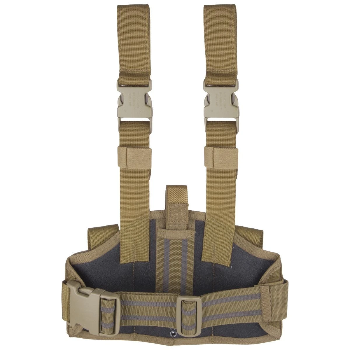 A durable leg platform with hidden holster and MOLLE cross-webbing on a